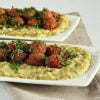 Akdeniz yeşilliği, közlenmiş domates, biber ve parmak patates eşliğinde.