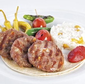 5 Adet köfte, Akdeniz yeşilliği, közlenmiş domates ve biber, parmak patates ve pilav eşliğinde.
