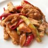 Panelenmiş tavuk, mantar sos, Amerikan peyniri, Akdeniz yeşilliği, parmak patates ve pilav eşliğinde.