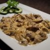 Panelenmiş tavuk, mantar sos, Amerikan peyniri, Akdeniz yeşilliği, parmak patates ve pilav eşliğinde.