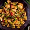 Tavuk parçaları, Akdeniz yeşilliği, jalapone biber, patates ve pilav eşliğinde.