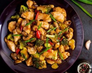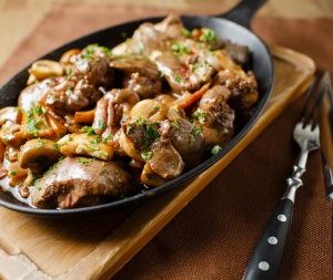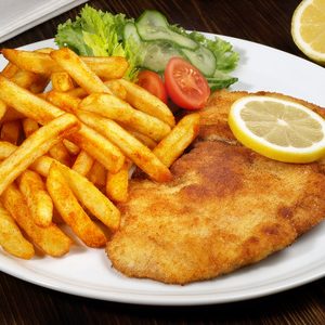 Panelenmiş tavuk, mantar sos, Amerikan peyniri, Akdeniz yeşilliği, parmak patates ve pilav eşliğinde.