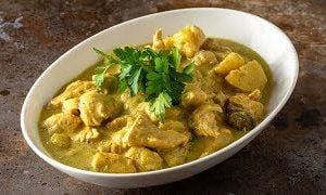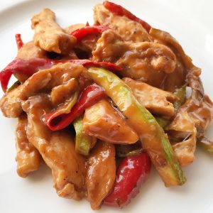 Tavuk parçaları, Akdeniz yeşilliği, jalapone biber, patates ve pilav eşliğinde.