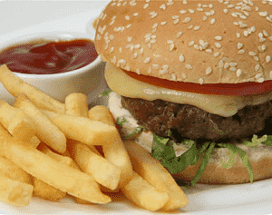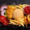 Parmak patates, yeşillik, 3 soğan halkası eşliğinde.