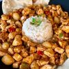 Tavuk parçaları, Akdeniz yeşilliği, jalapone biber, patates ve pilav eşliğinde.